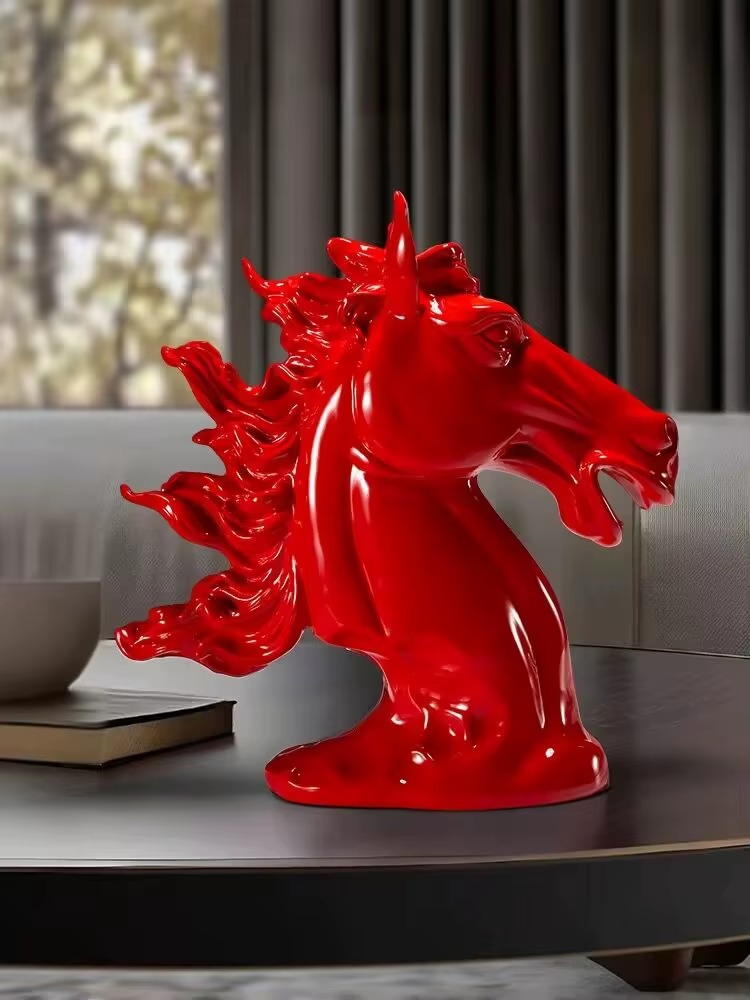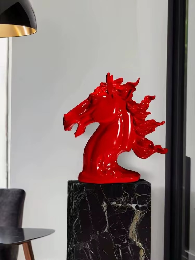 Designová socha jezdce je skulptura s ohromující vizuální silou. Zobrazuje hlavu koně v dynamické pozici, s rozvlněnou hřívou a otevřenou tlamou, což symbolizuje nezkrotnou energii, svobodu a vitalitu. Lesklé, sytě červené provedení z ní dělá nepřehlédnutelný prvek.