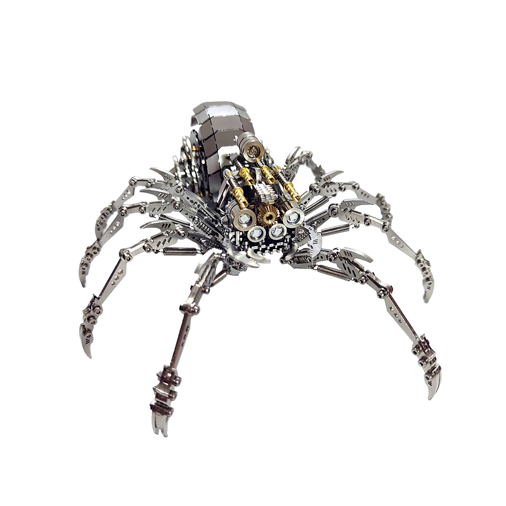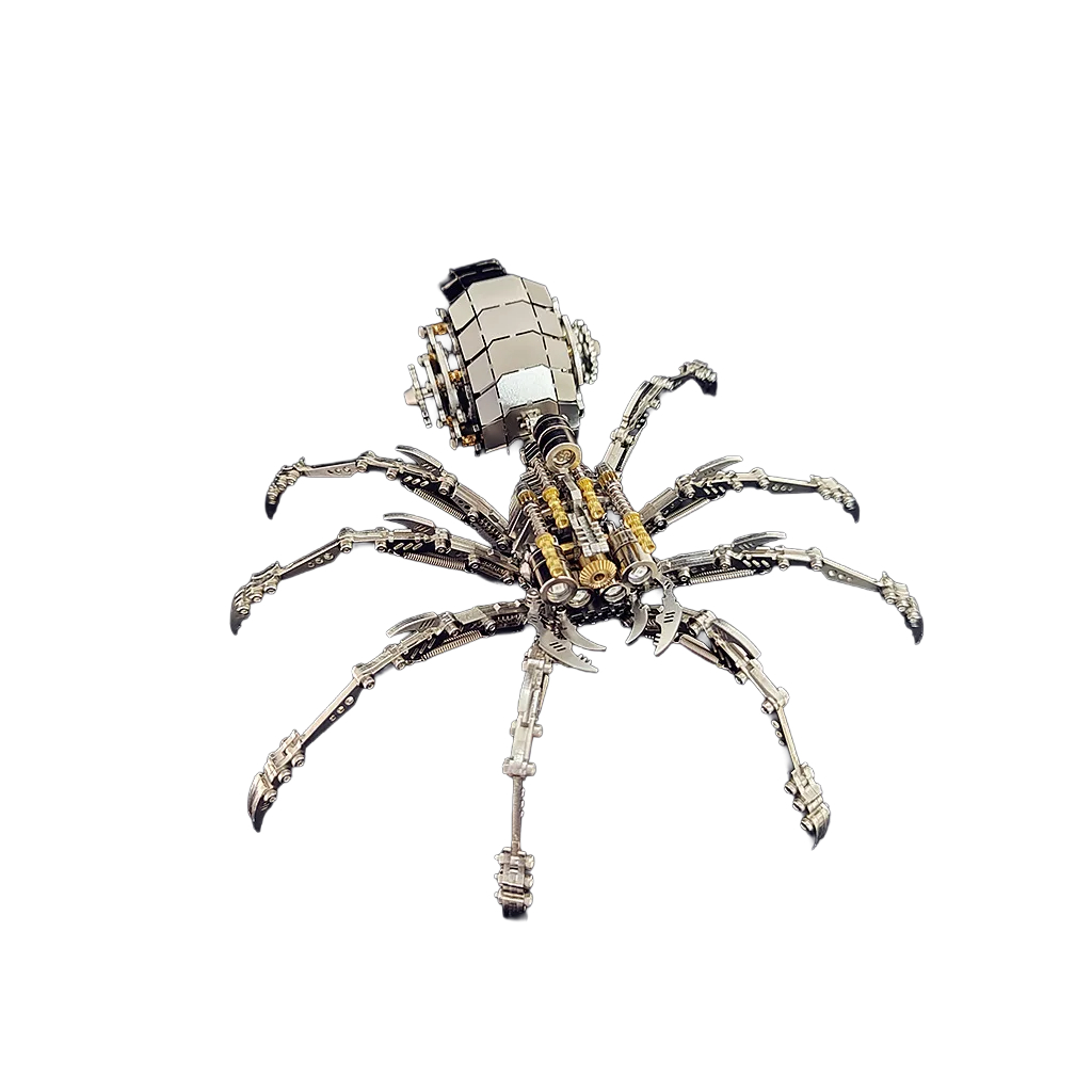 - Detailní a realistické ztvárnění: Model věrně zachycuje charakteristické rysy pavouka, včetně jeho osmi kloubových nohou, trupu a hlavy, avšak s výraznou mechanickou estetikou. Detaily jako ozubená kolečka, šrouby a písty jsou pečlivě ztvárněny, což modelu dodává autentický a živý, přesto robotický vzhled.