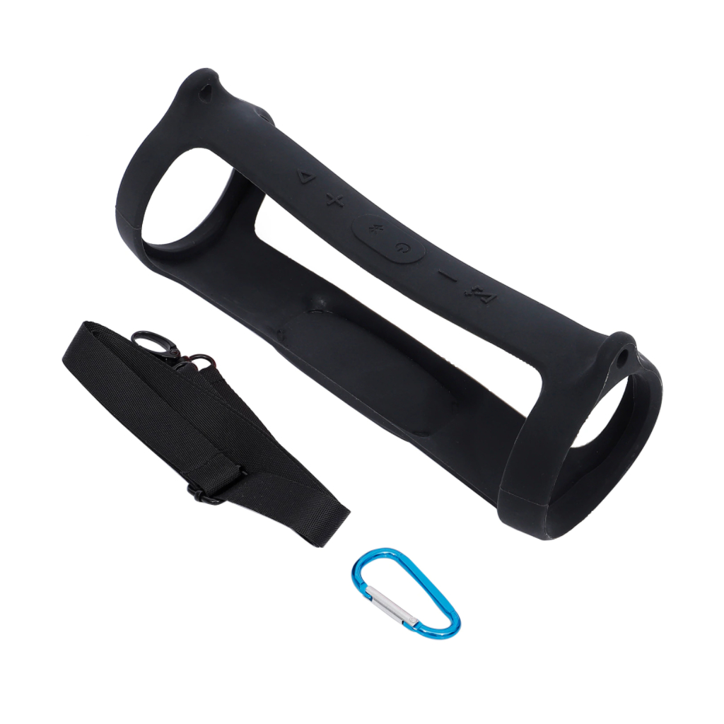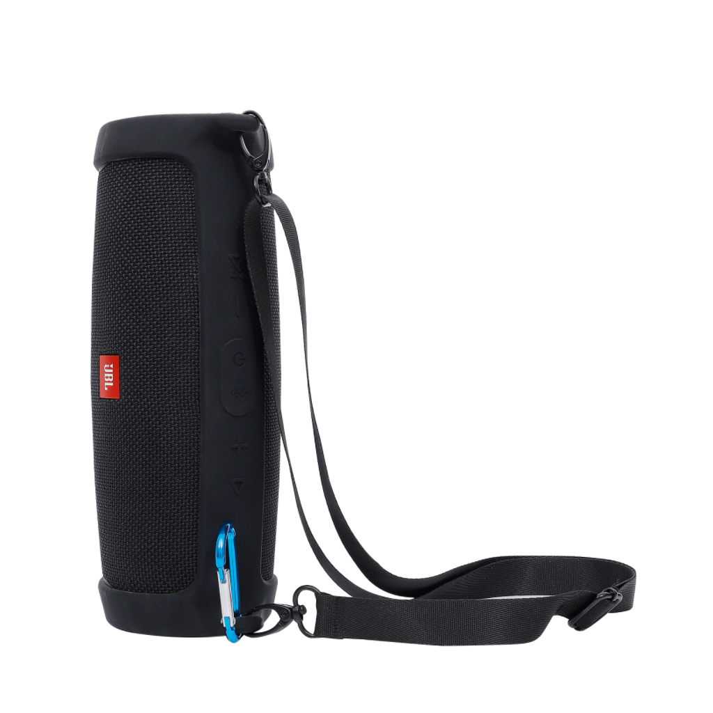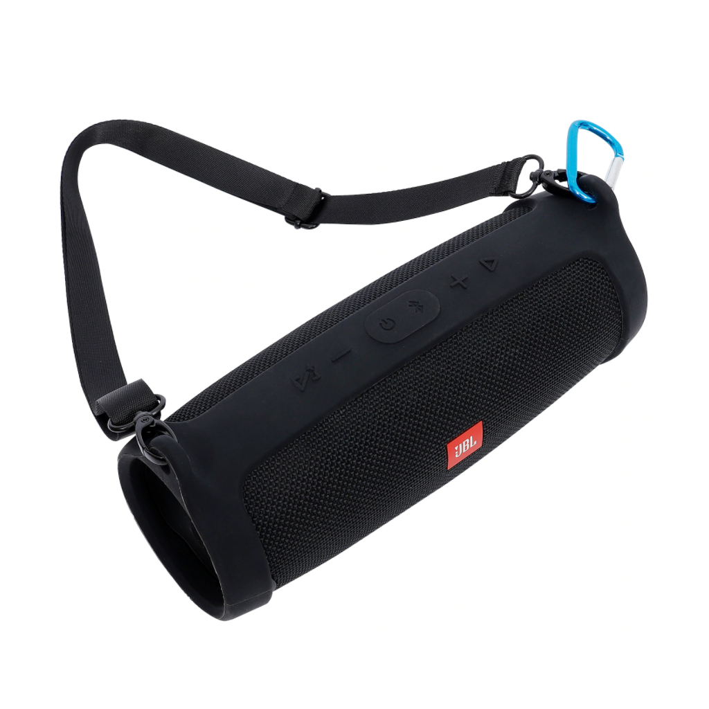 Silikonový ochranný kryt s karabinou pro přenášení bezdrátového bluetooth reproduktoru JBL Charge 3, 4, 5. Vhodné pro nošení přes rameno, nebo připnuté k batohu za karabinu.