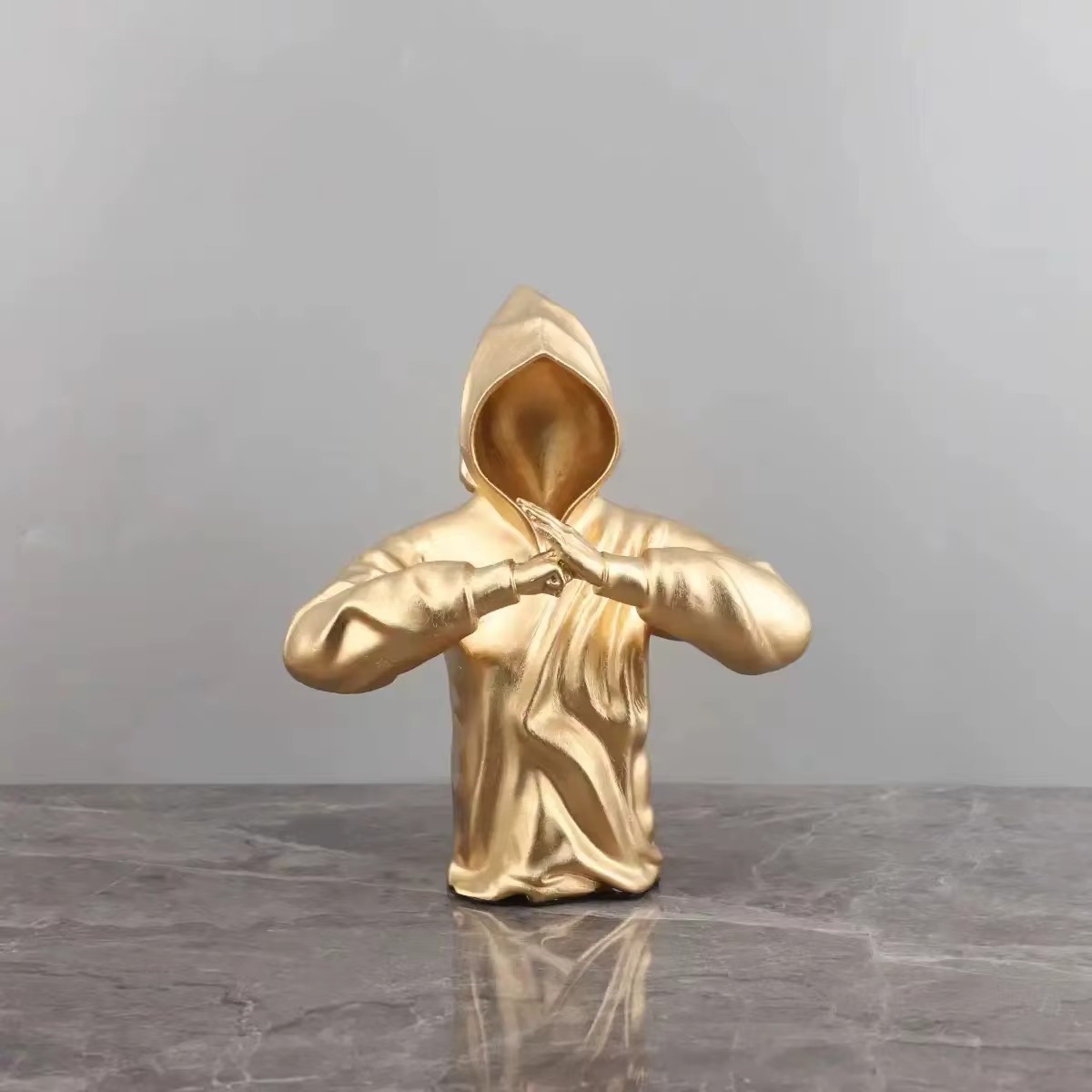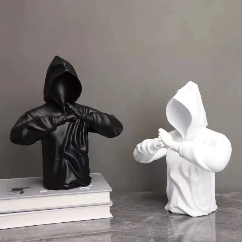 Tato Socha bojovníka není jen dekorace – je to ztělesnění disciplíny, ticha a soustředění. Její minimalistický, matně černý design s postavou zahalenou v kapuci vzbuzuje dojem tajemství a neklidné síly. Gesto spojených rukou představuje moment před akcí nebo hlubokou meditaci.
