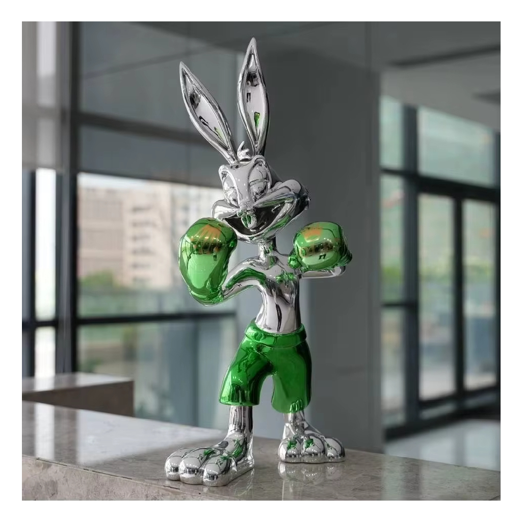 Socha vyniká především svým povrchem, který má lesklý chromový efekt. Tělo králíka je v elegantní stříbrné barvě, zatímco jeho boxerky a rukavice se blyští sytě zeleným metalickým leskem. Tento barevný kontrast je velmi působivý a vytváří dynamický a poutavý vzhled.